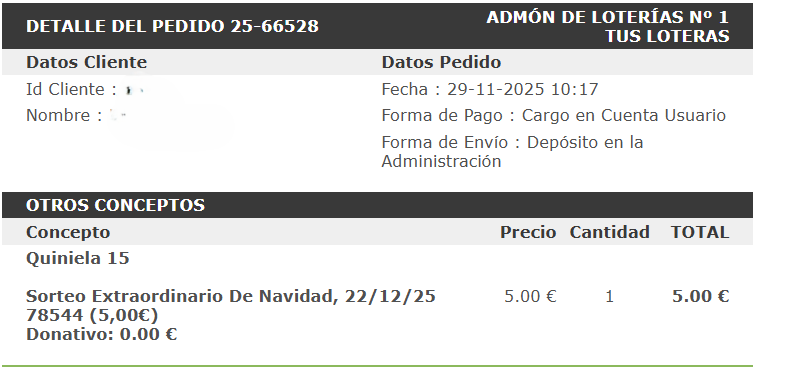 Tique @tique MEM ↪ juan53 · (0 p) #- Concurso Quiniela15 @tique lleva 0 aciertos (puntos) esta temporada y va en la posición #- del ranking del concurso de quinielistas. · hace 1 día Buenos días Juan!Cuando venga su hija a casa dígale que acceda a la página Tus Loteras.com y una vez dentro que clike en la pestaña Mi Cuenta y después en Movimientos cuenta y ahí mismo debe aparecer la compra de la participación. Lo que sucede es que la misma administración nos guarda el nº hasta el día del sorteo. · Responder (1) Expandir comentario Juan Trabalón @juan53 TOP MEM ↪ tique · (177 p) #130 Concurso Quiniela15 @juan53 lleva 177 aciertos (puntos) esta temporada y va en la posición #130 del ranking del concurso de quinielistas. · hace 1 día Se lo agradezco Tique, ya mí hija tiene la participación de 10 euros. 🌹. · Responder (0) Expandir comentario