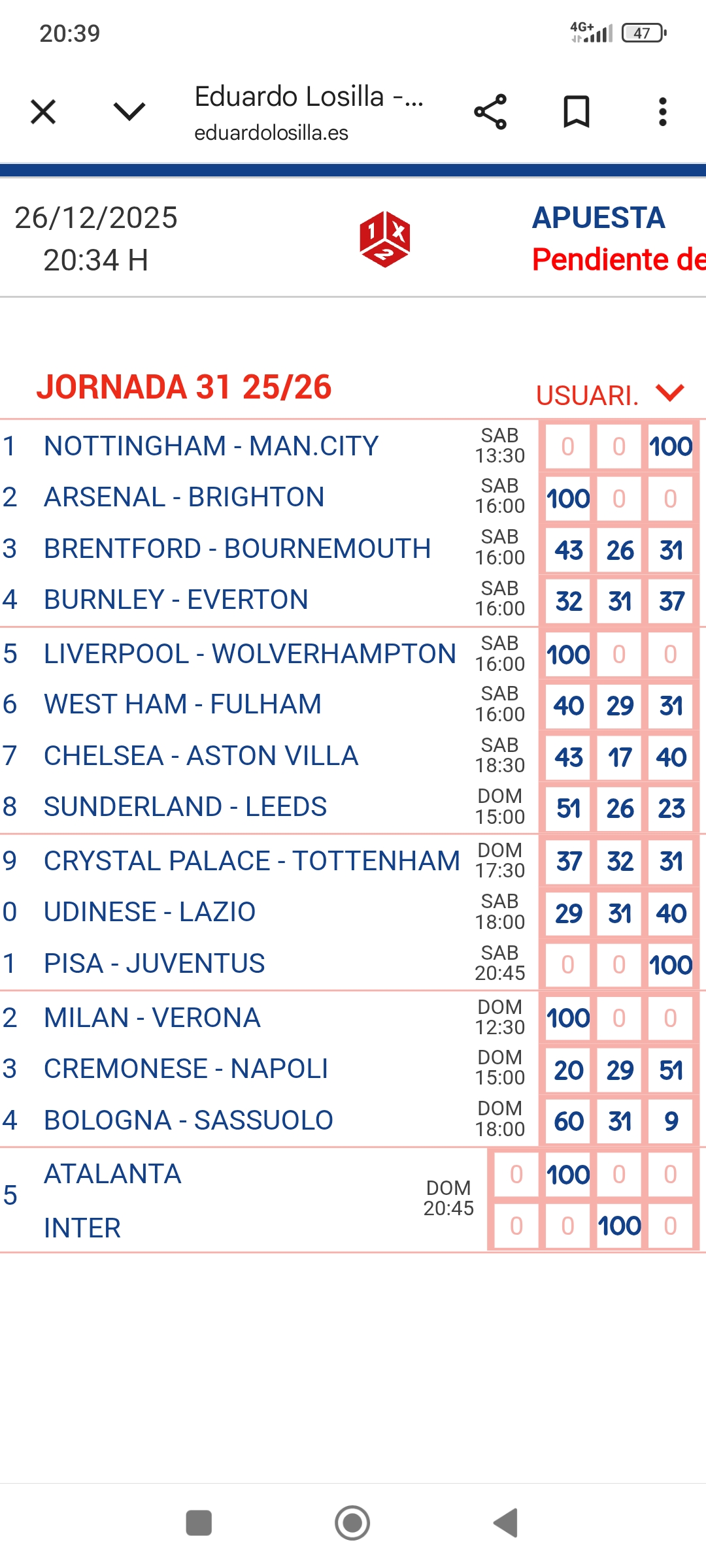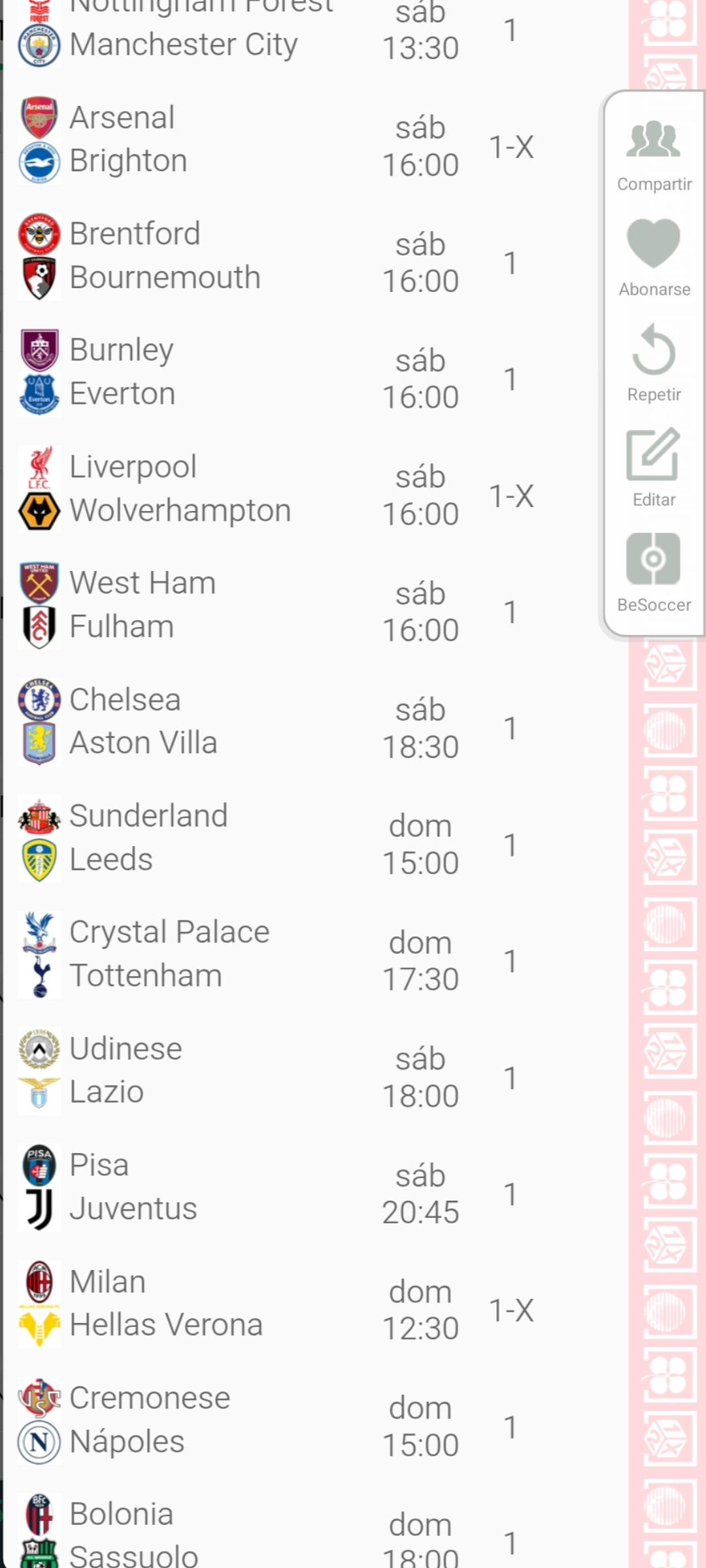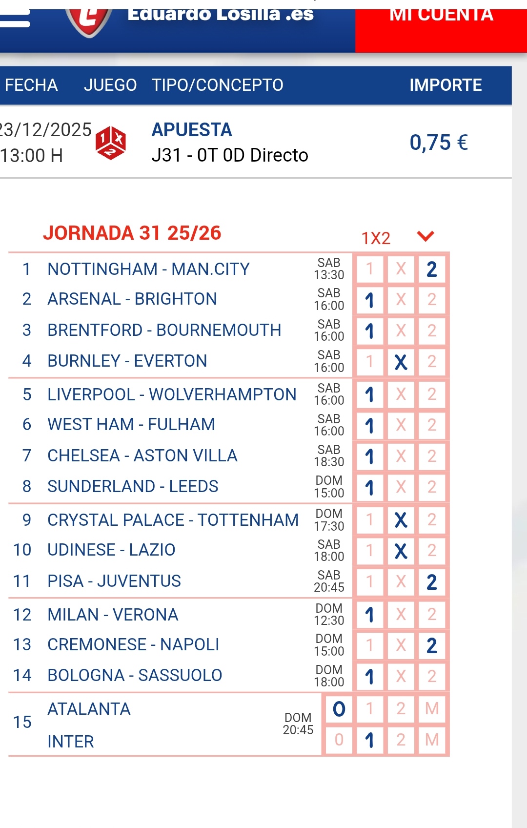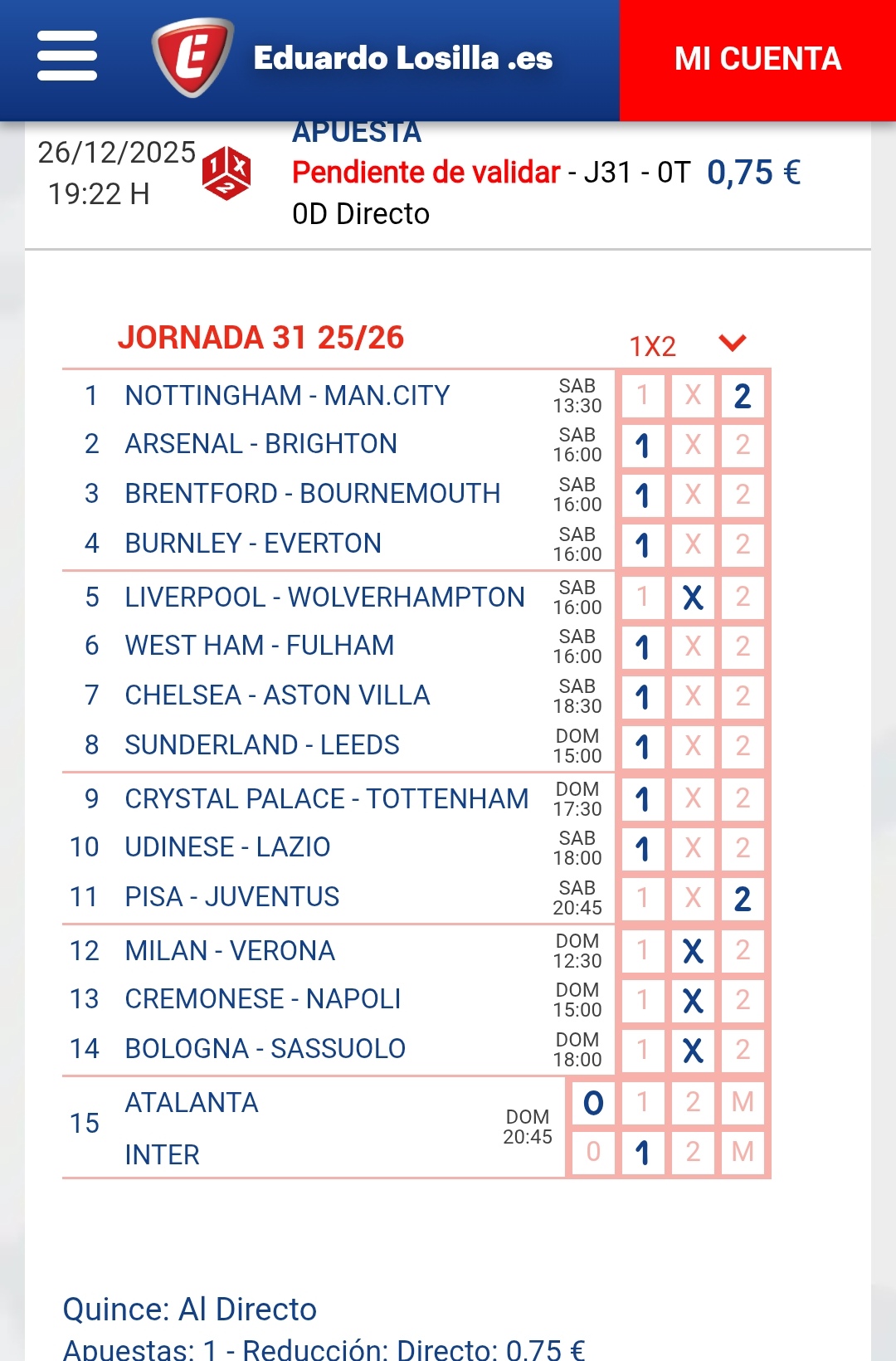 carmelo @cargom TOP MEM · (209 p) #118 Concurso Quiniela15 @cargom lleva 209 aciertos (puntos) esta temporada y va en la posición #118 del ranking del concurso de quinielistas. · hace 1 día · ⤤ Pisa-Juventus Sólo una victoria de los locales en el campeonato. En casa han rascado empates. No hay que perder de vista que han empatado la mitad de los partidos. La victoria con otro recién ascendido Aún con todo la Juve sólo ha perdido un partido de los últimos Sólo ha cedido en campo del actual campeón el Napoli. Aunque sea reñida o sufrida aquí debería haber victoria visitante 2 · Responder (1) Expandir comentario carmelo @cargom TOP MEM ↪ cargom · (209 p) #118 Concurso Quiniela15 @cargom lleva 209 aciertos (puntos) esta temporada y va en la posición #118 del ranking del concurso de quinielistas. · hace 12 horas Un partido perdido de los últimos seis la Juve quería decir. Que me he dejado la frase a mitad😀 · Responder (0) Expandir comentario