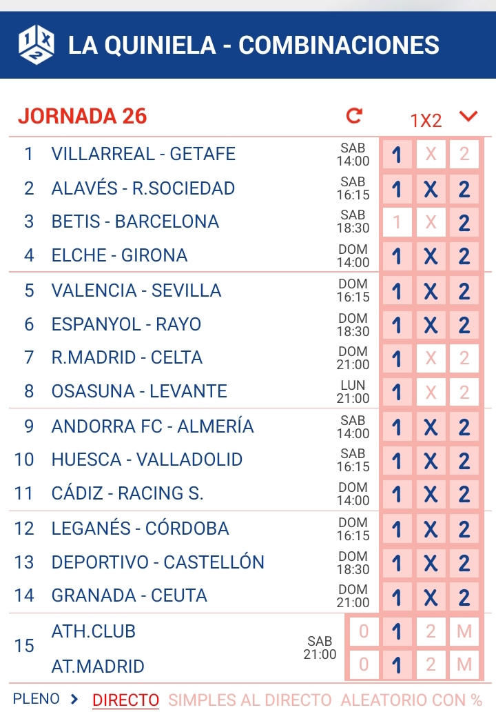 Pronóstico quiniela de la jornada 26, con partidos de La Liga y Segunda División.