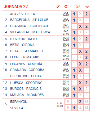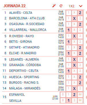 Resultados en directo de la quiniela correspondiente a la jornada 22, con partidos de La Liga y Segunda División.