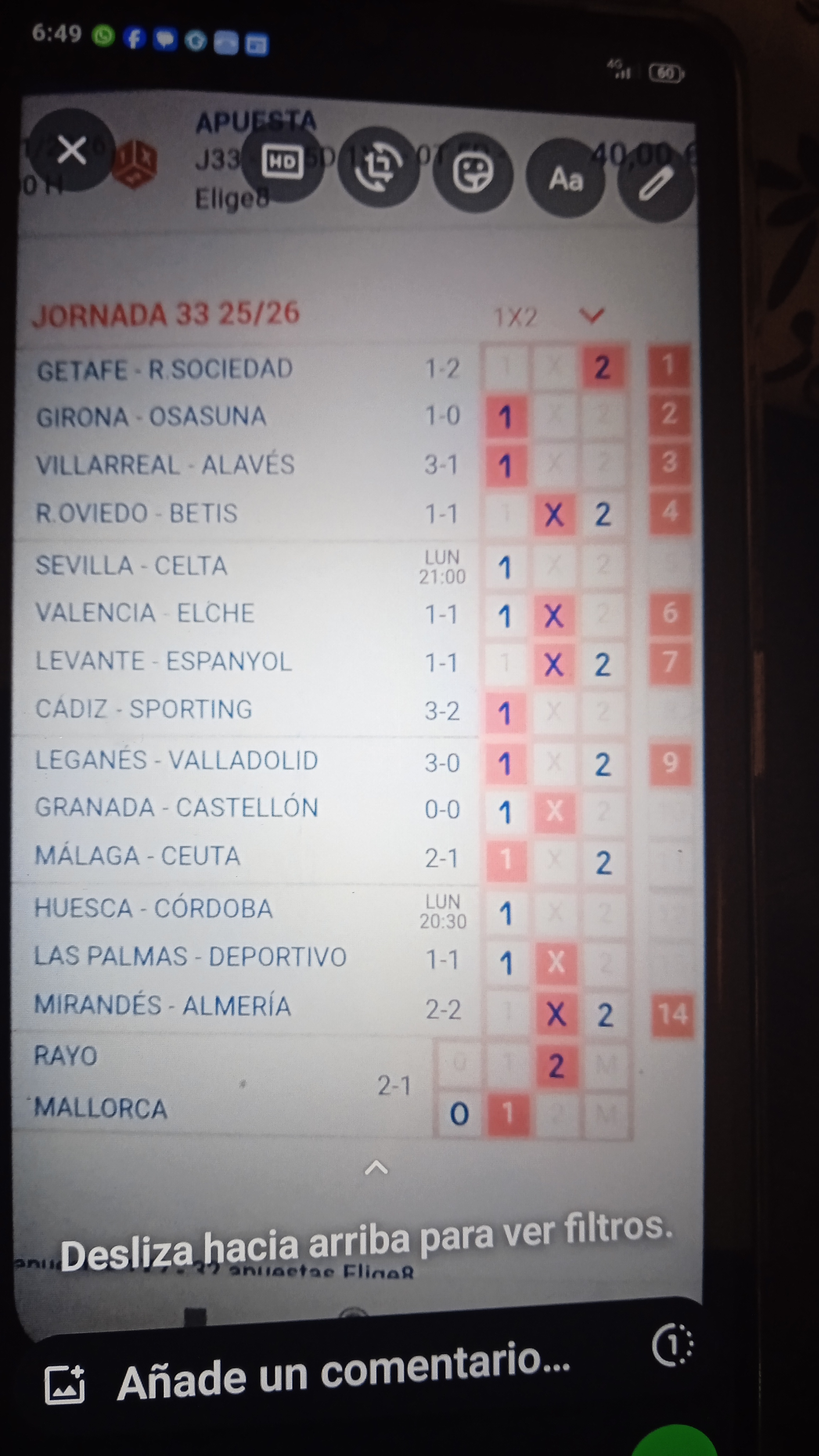 Resultados en directo de la quiniela correspondiente a la jornada 33, con partidos de La Liga y Segunda División.