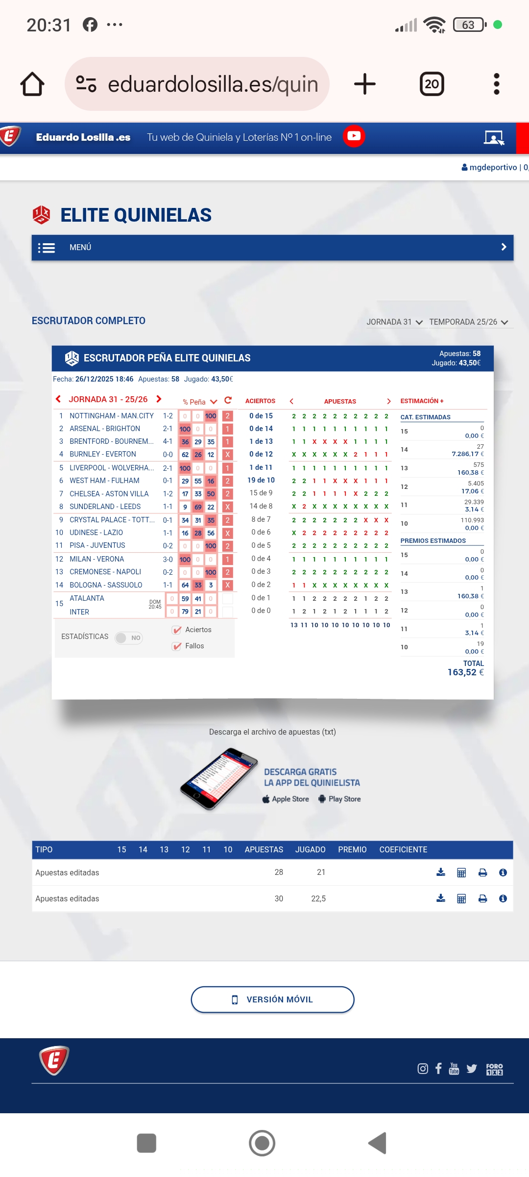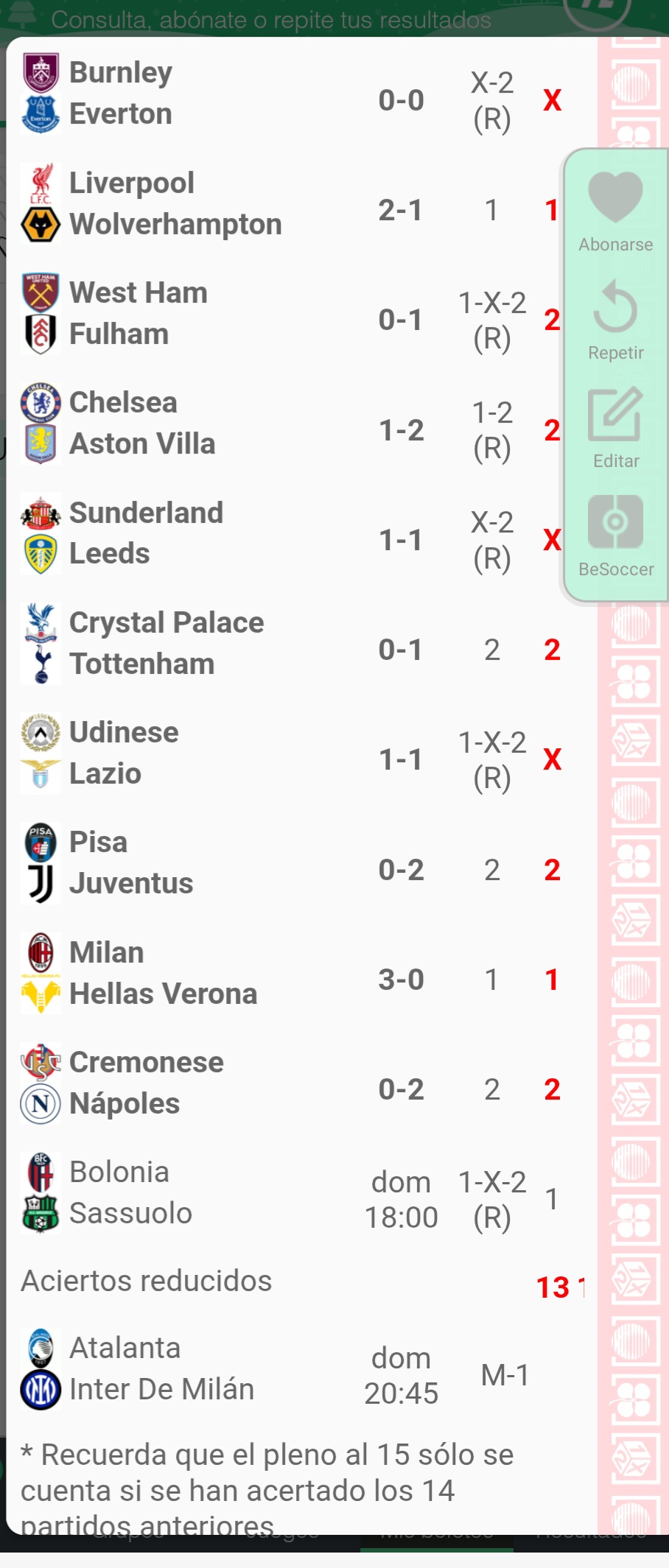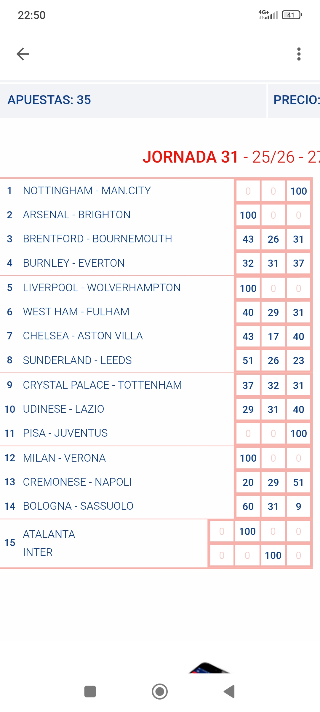 Resultados en directo de la quiniela correspondiente a la jornada 31, con partidos de Premier League y Serie A.