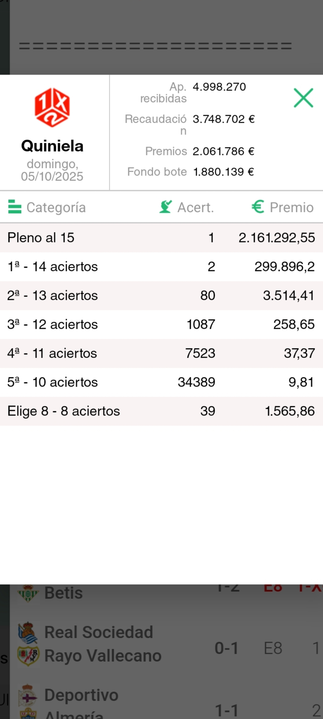 . Al finalizar cada jornada, mostramos los premios que se reparten, asi como los aciertos conseguidos.