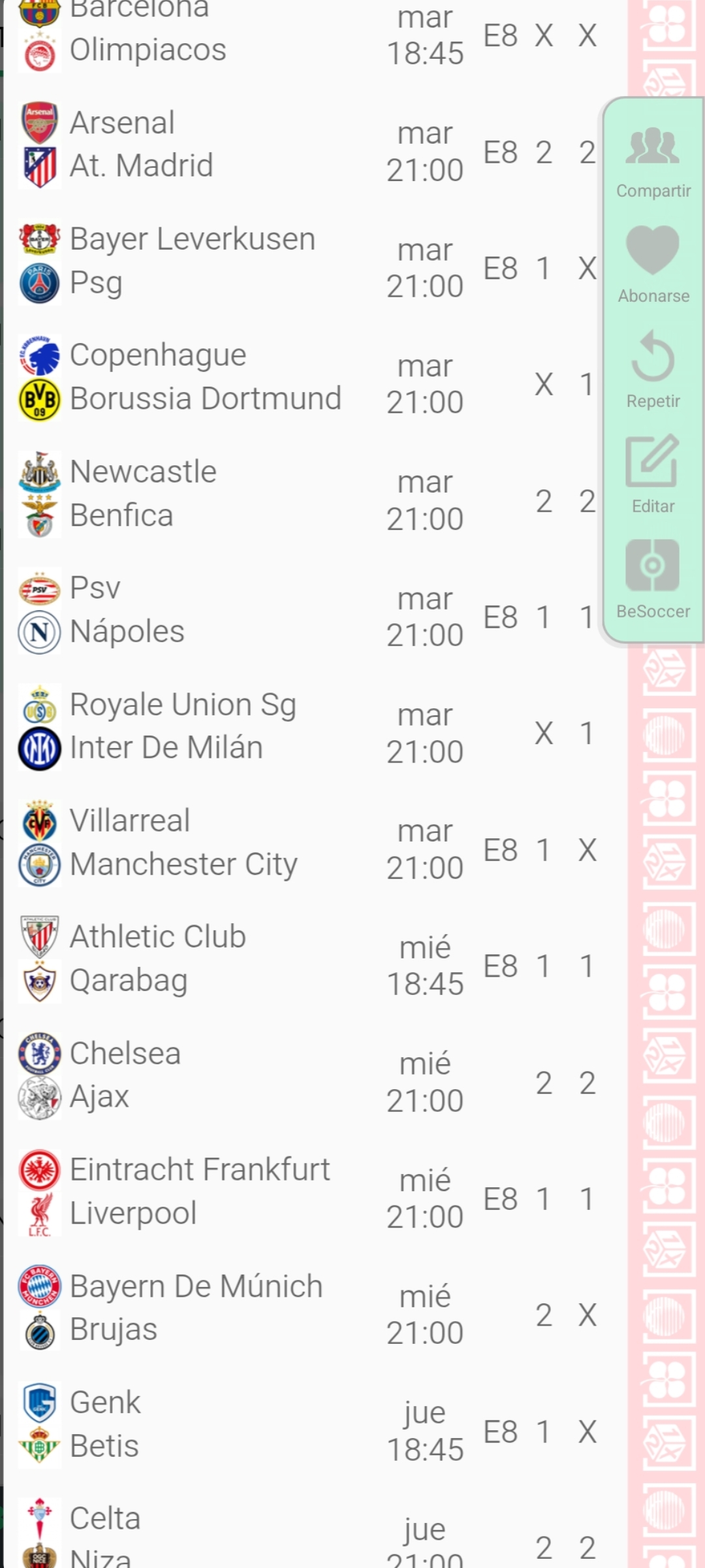 Resultados en directo de la quiniela correspondiente a la jornada 15, con partidos de UEFA Champions League y UEFA Europa League.