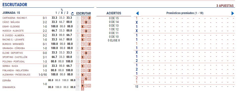 Resultados en directo de la quiniela correspondiente a la jornada 15, con partidos de Segunda División y UEFA Nations League.