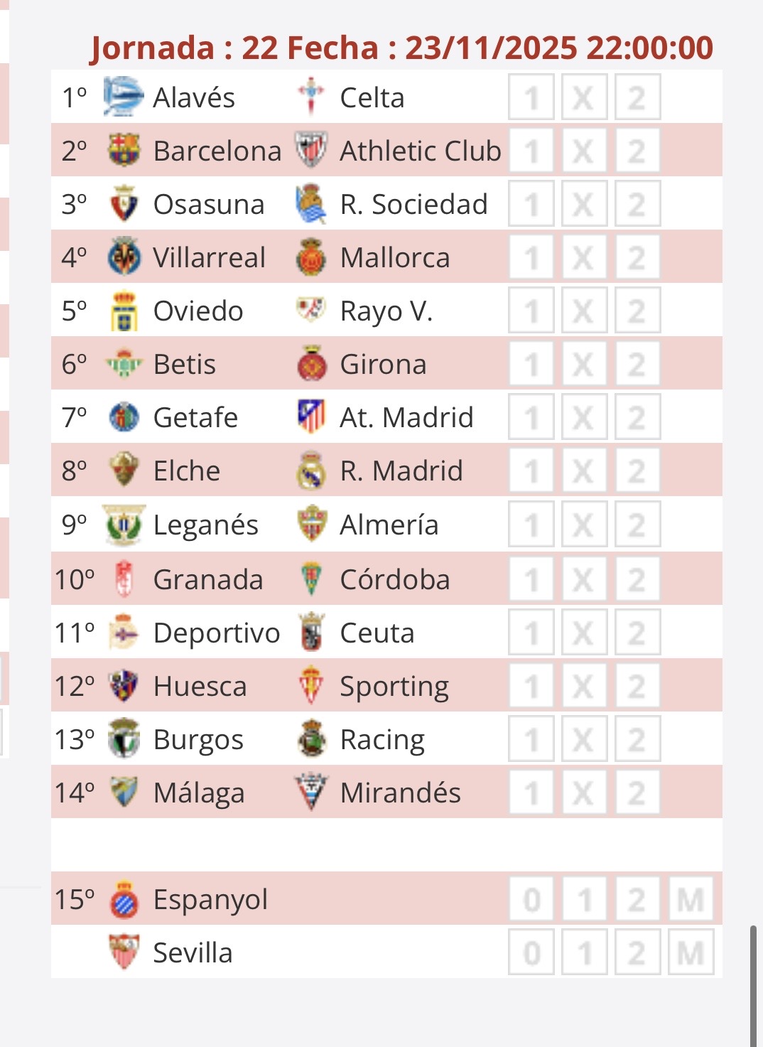 Resultados en directo de la quiniela correspondiente a la jornada 19, con partidos de La Liga y Segunda División.