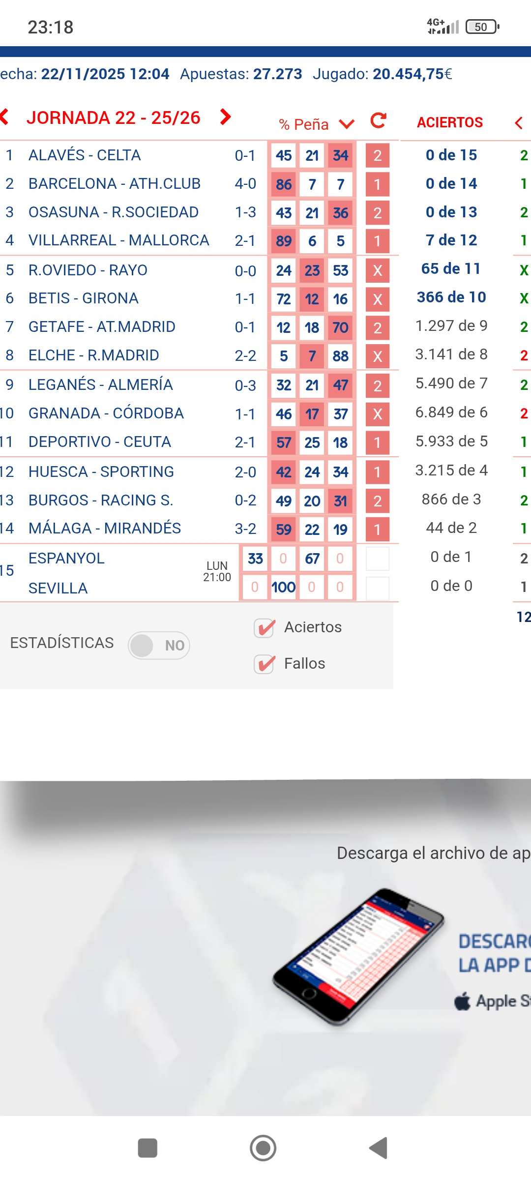 Resultados en directo de la quiniela correspondiente a la jornada 22, con partidos de La Liga y Segunda División.