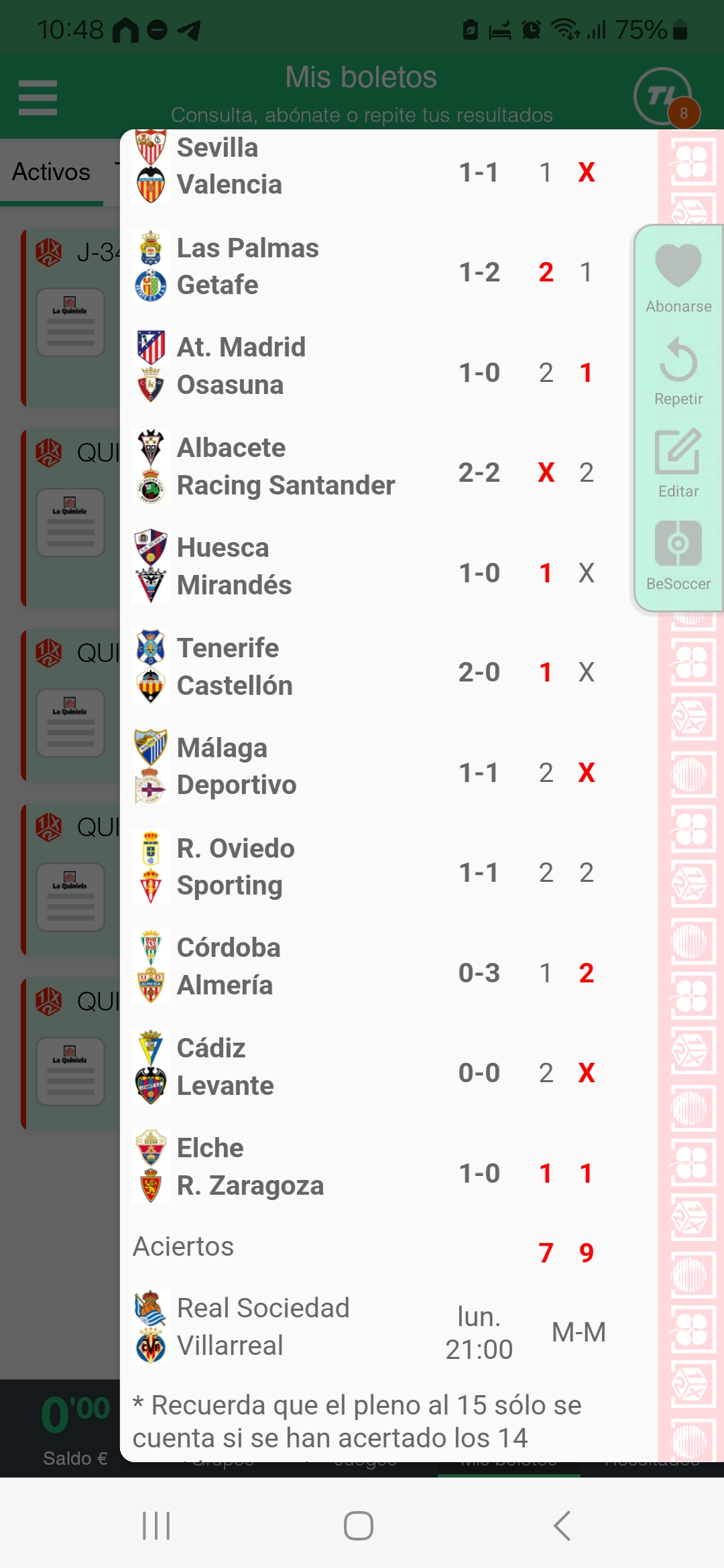 Resultados en directo de la quiniela correspondiente a la jornada 34, con partidos de La Liga y Segunda División.