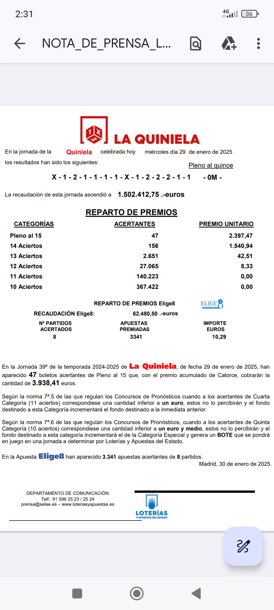 . Al finalizar cada jornada, mostramos los premios que se reparten, asi como los aciertos conseguidos.