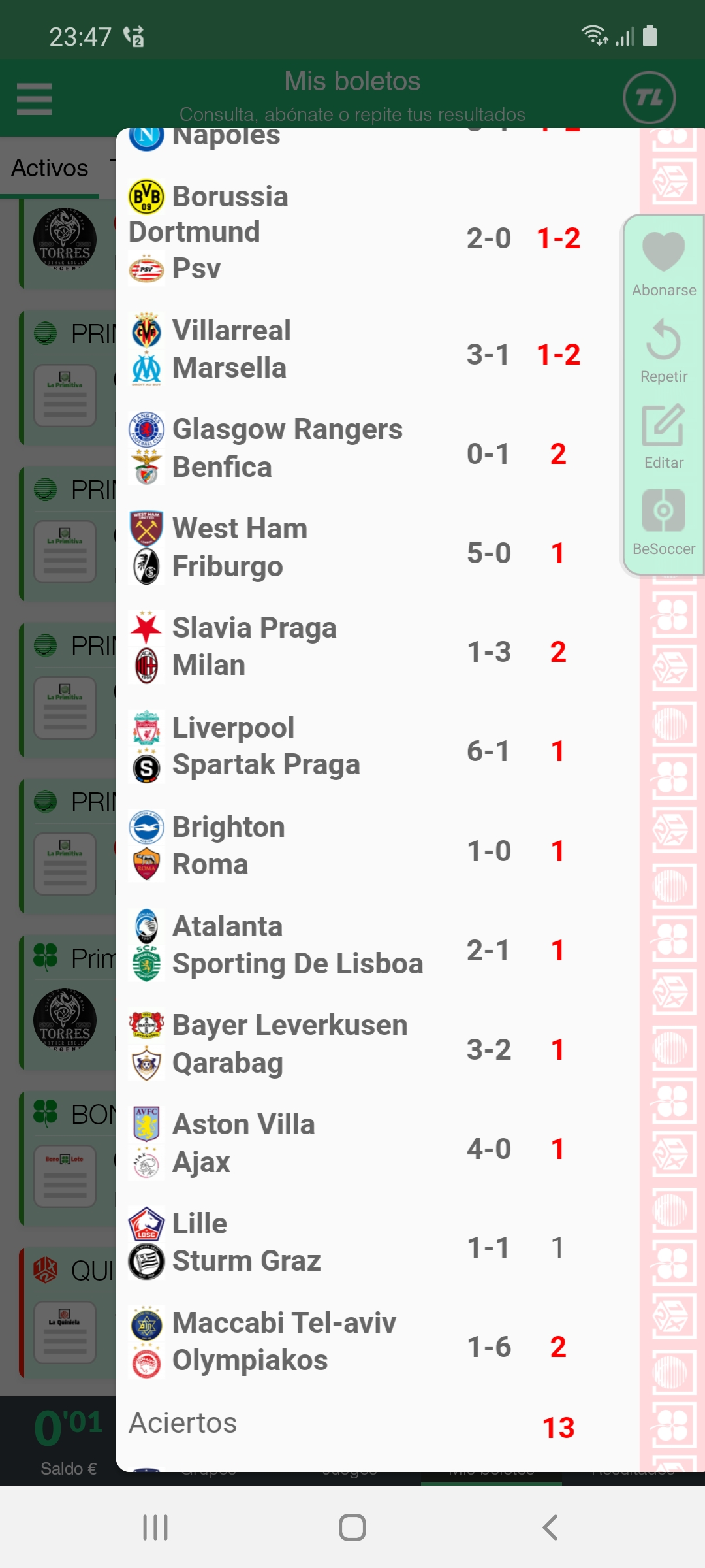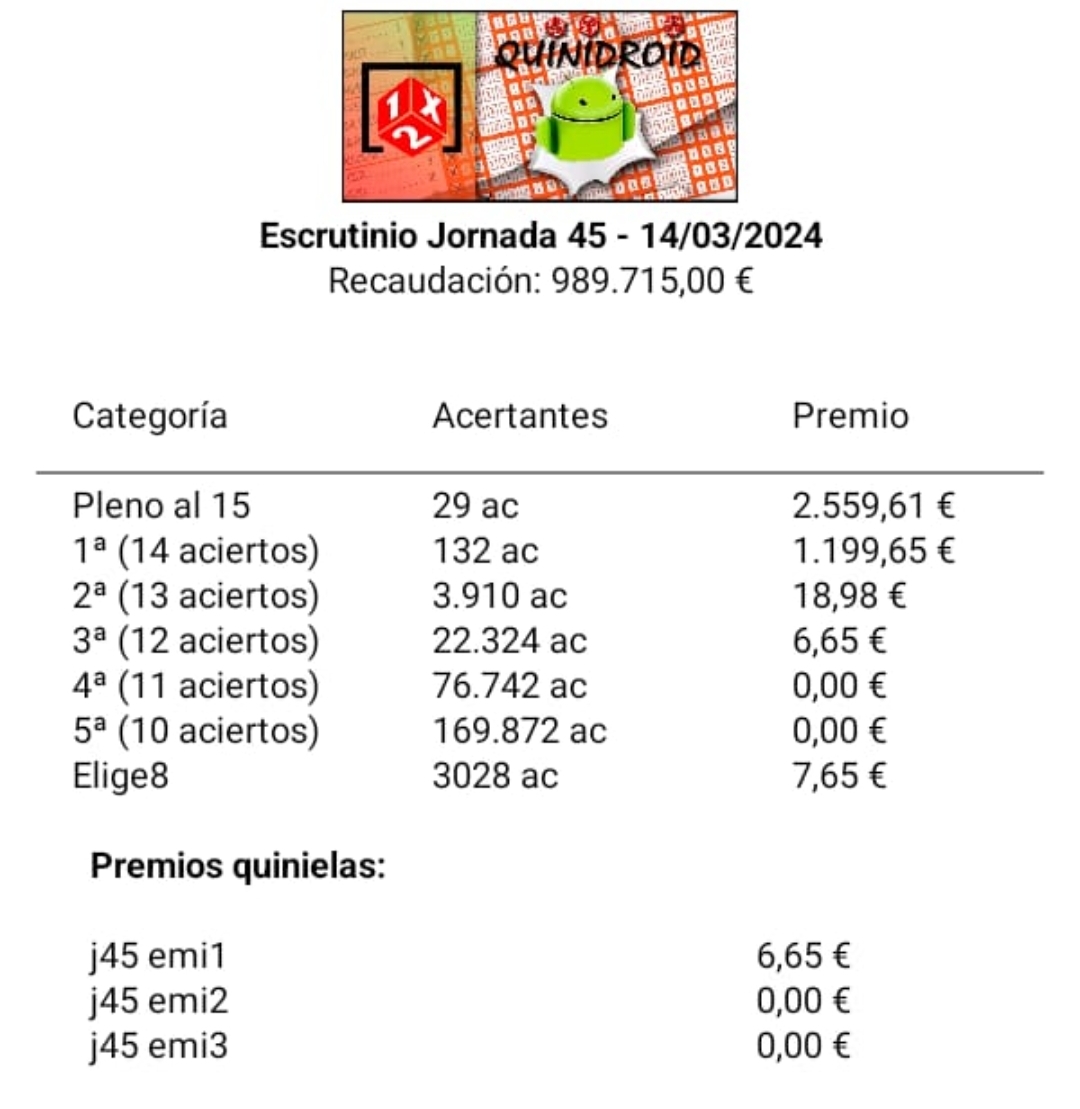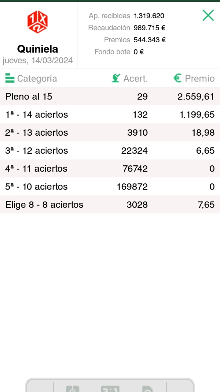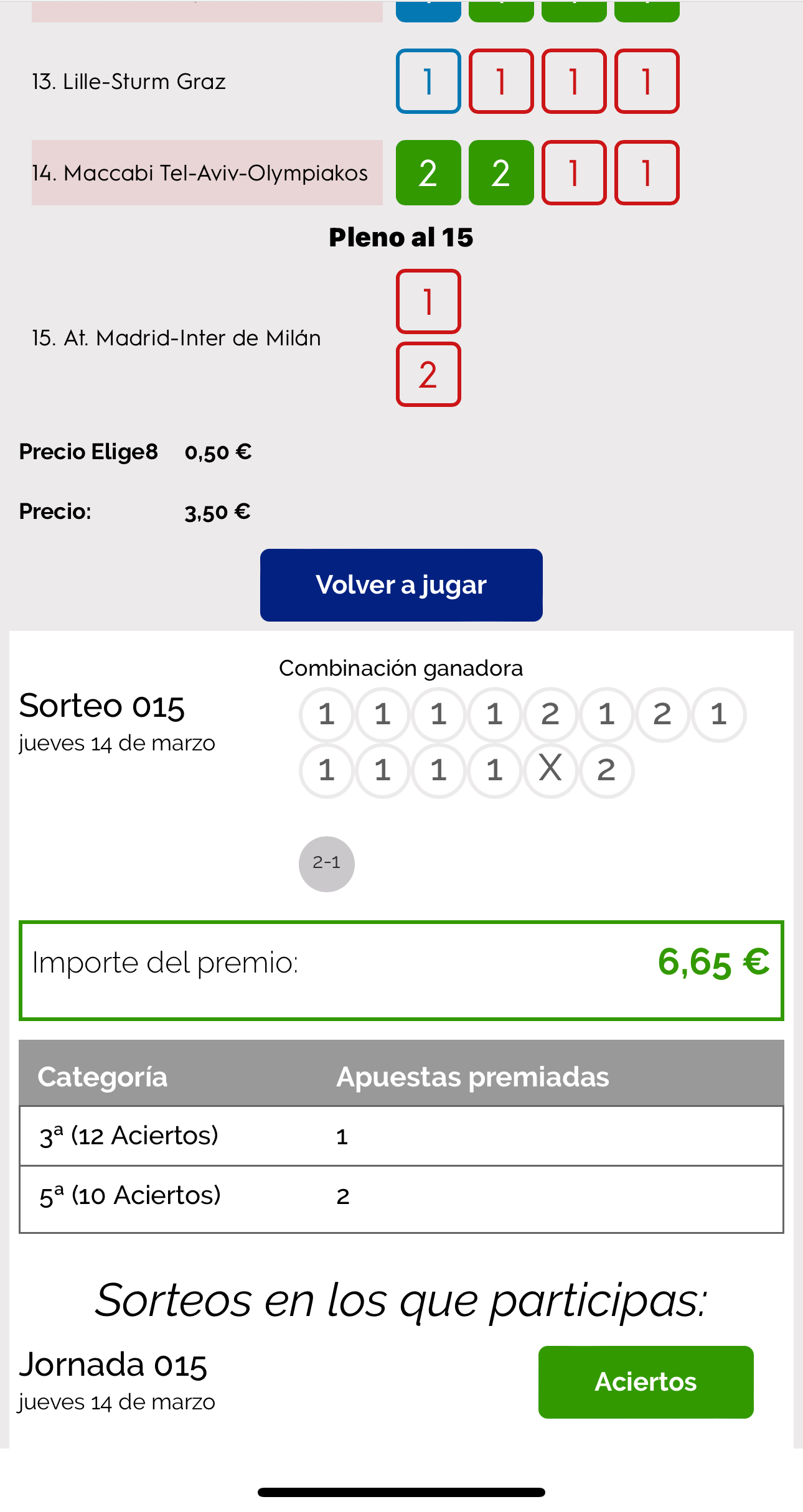 . Al finalizar cada jornada, mostramos los premios que se reparten, asi como los aciertos conseguidos.