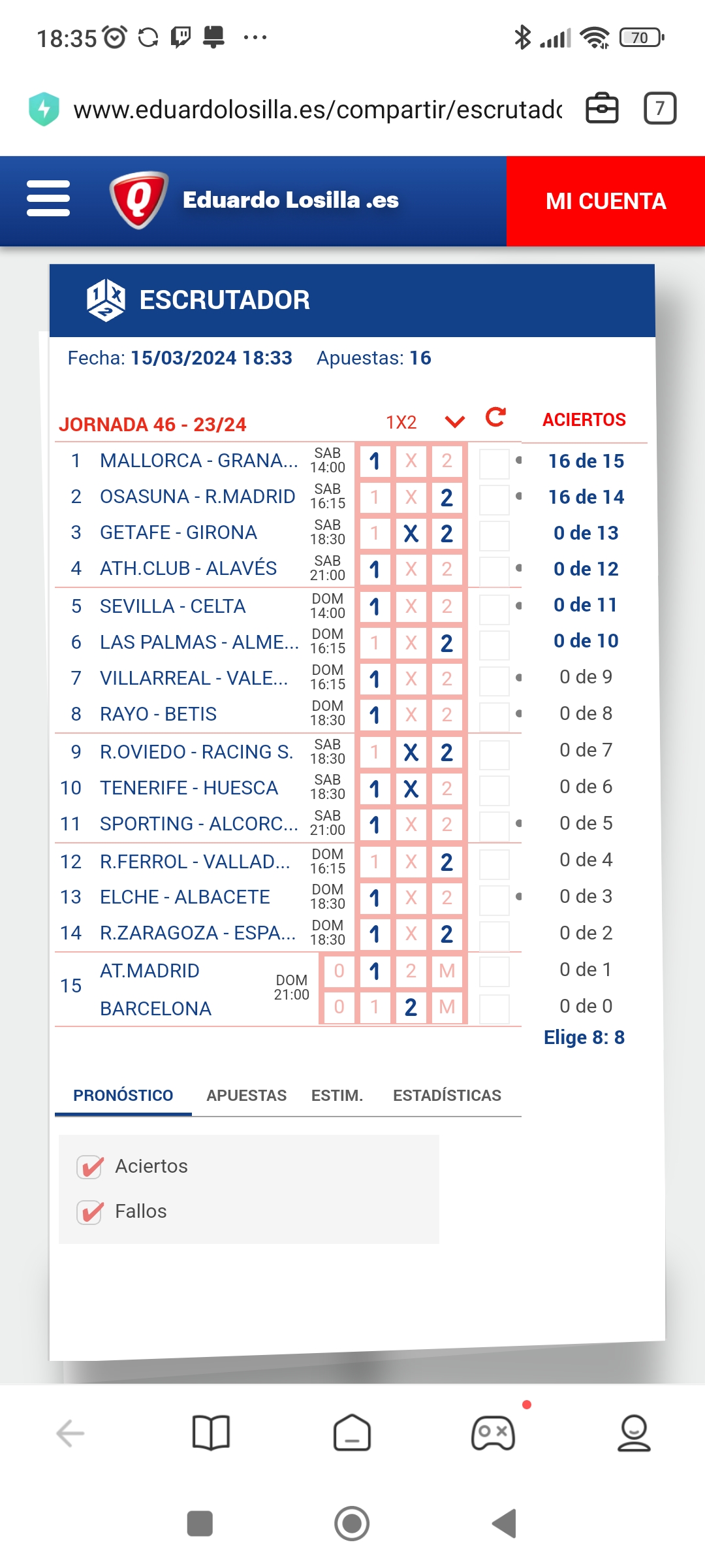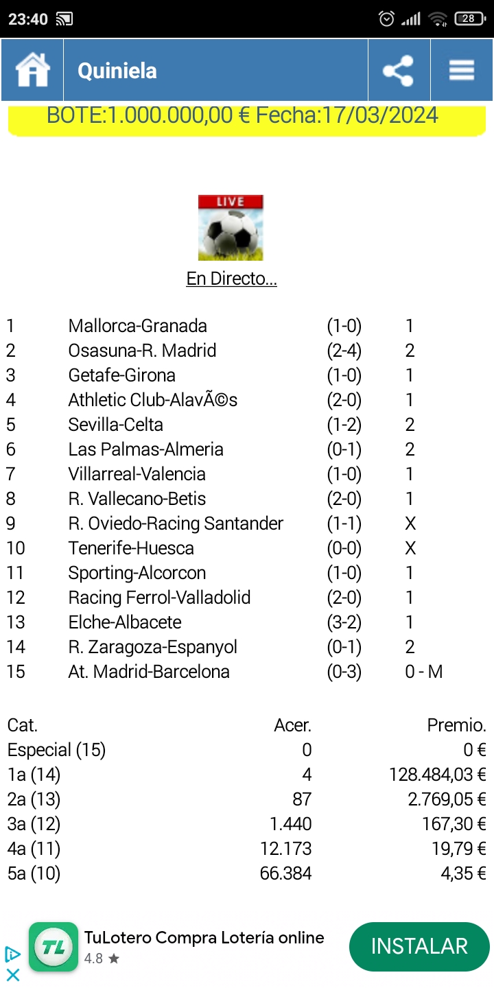 Resultados en directo de la quiniela correspondiente a la jornada 46, con partidos de La Liga y Segunda División.