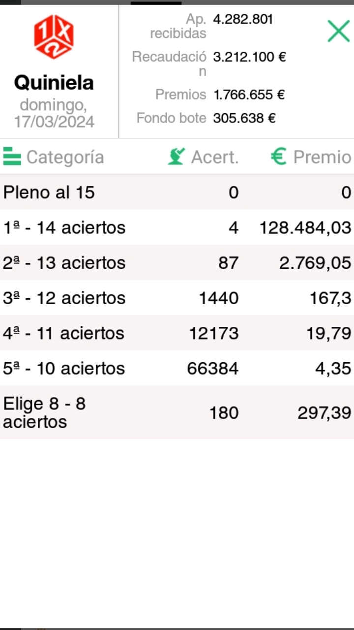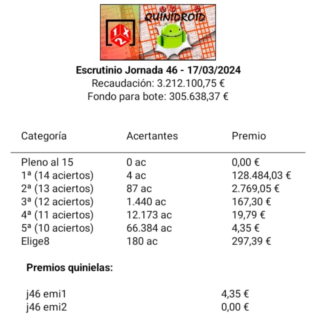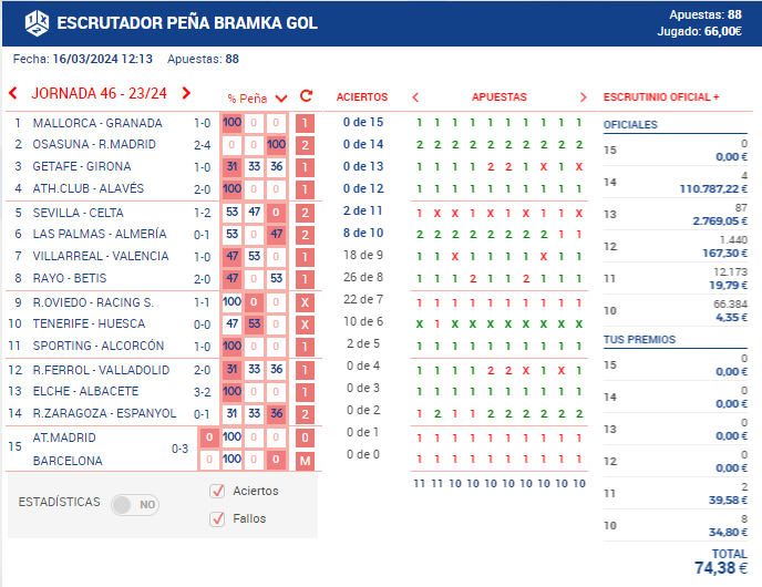 . Al finalizar cada jornada, mostramos los premios que se reparten, asi como los aciertos conseguidos.