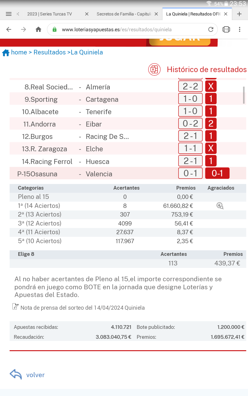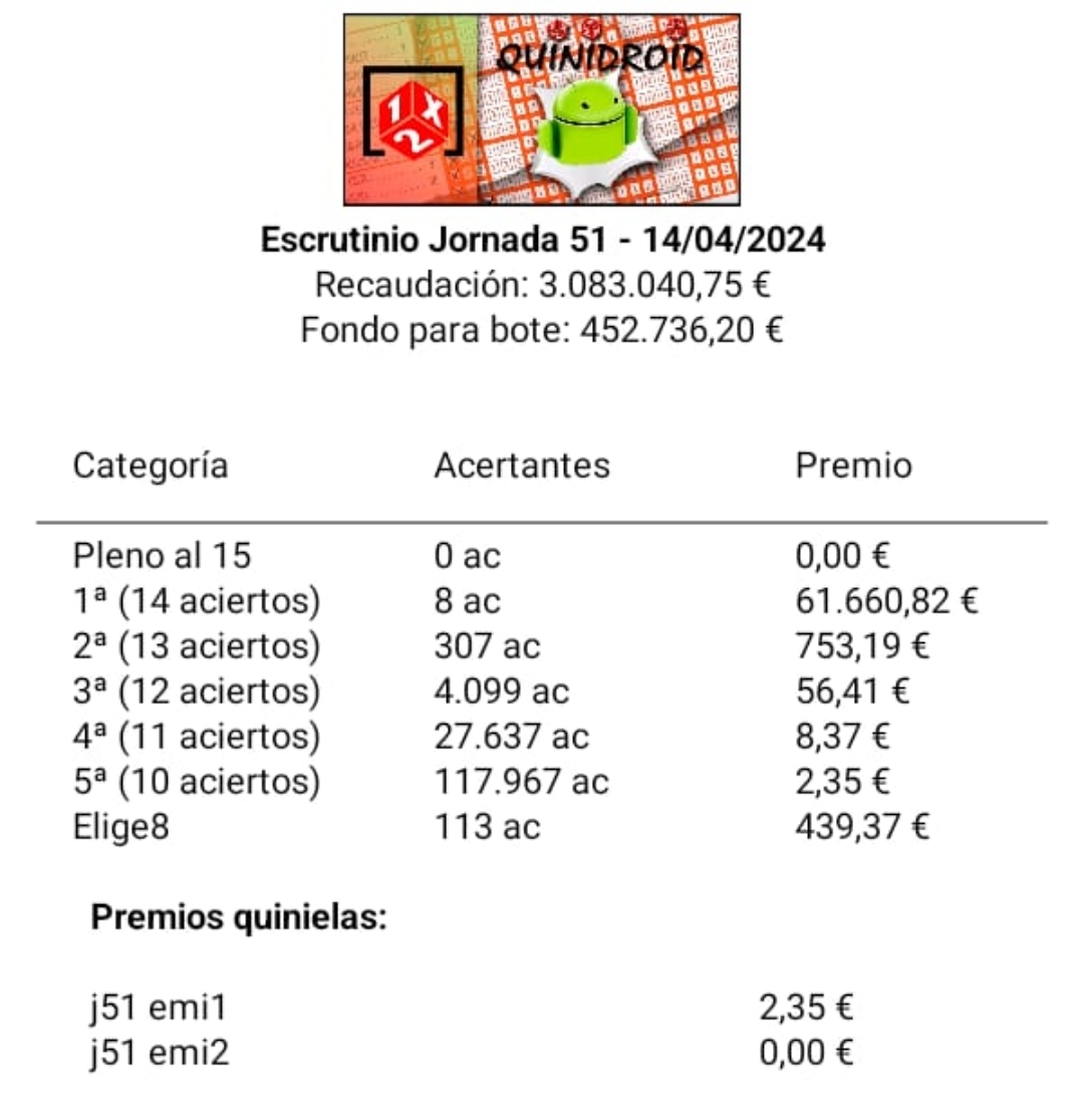 . Al finalizar cada jornada, mostramos los premios que se reparten, asi como los aciertos conseguidos.