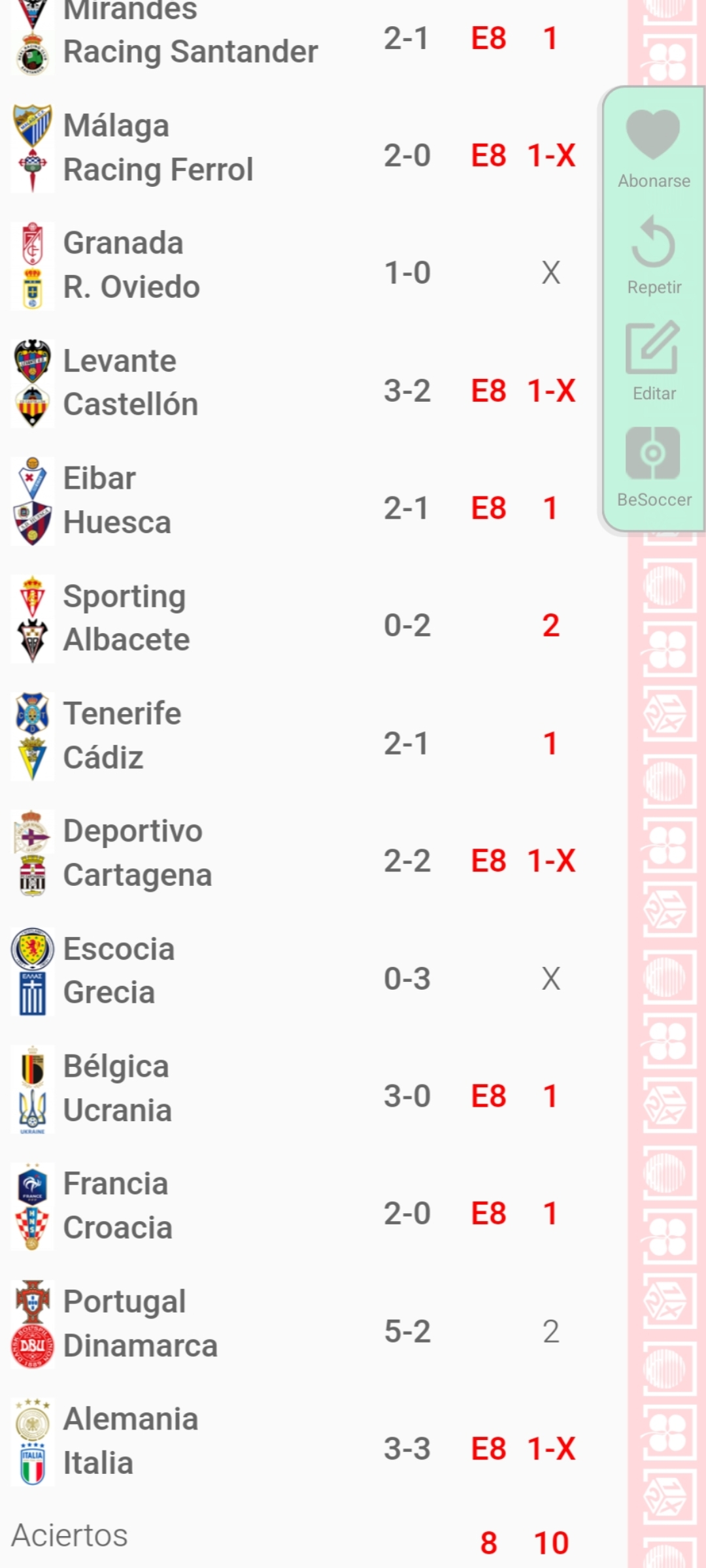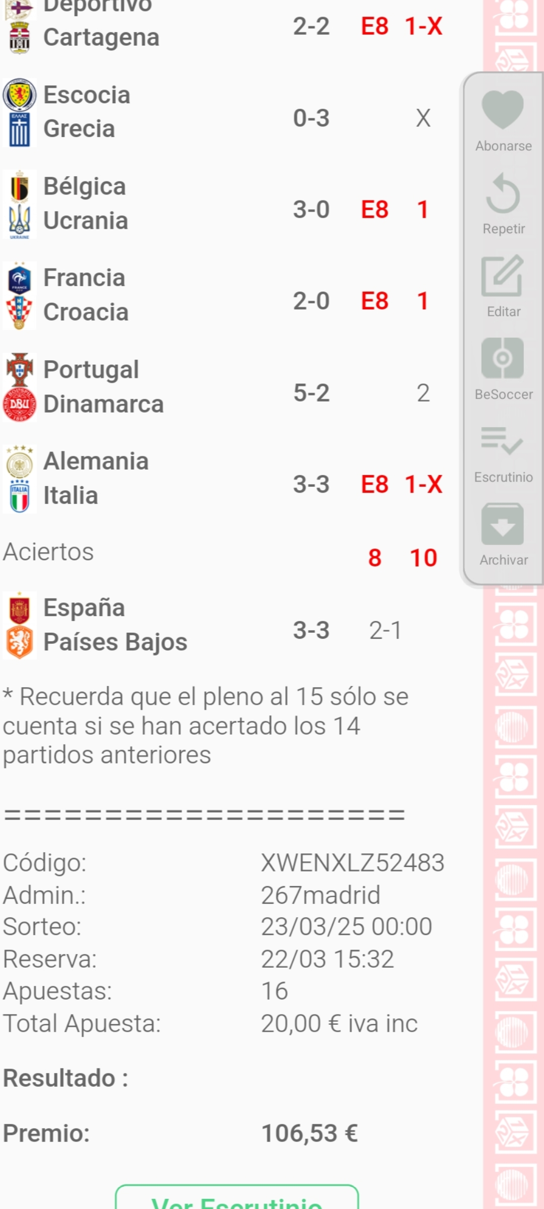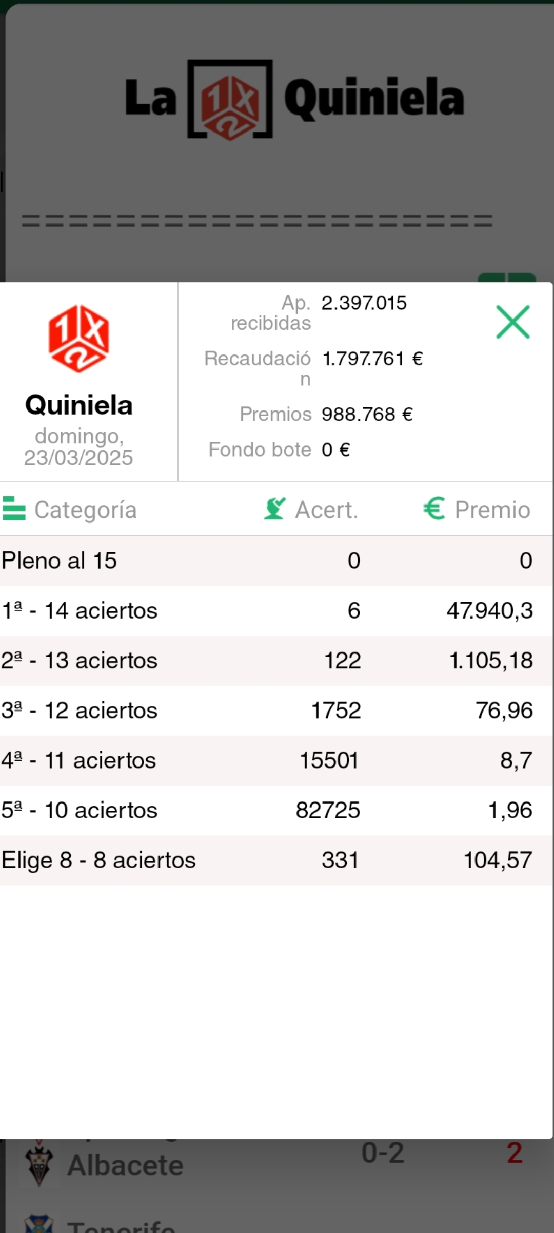 . Al finalizar cada jornada, mostramos los premios que se reparten, asi como los aciertos conseguidos.