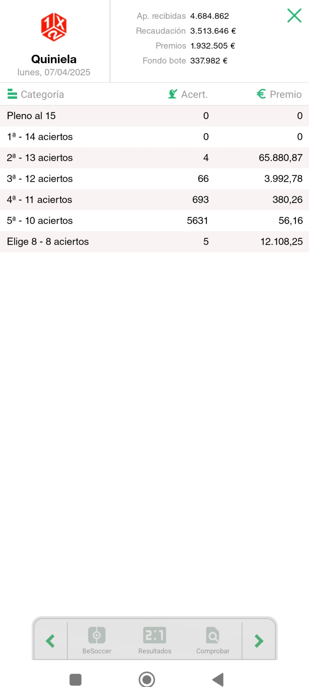 . Al finalizar cada jornada, mostramos los premios que se reparten, asi como los aciertos conseguidos.