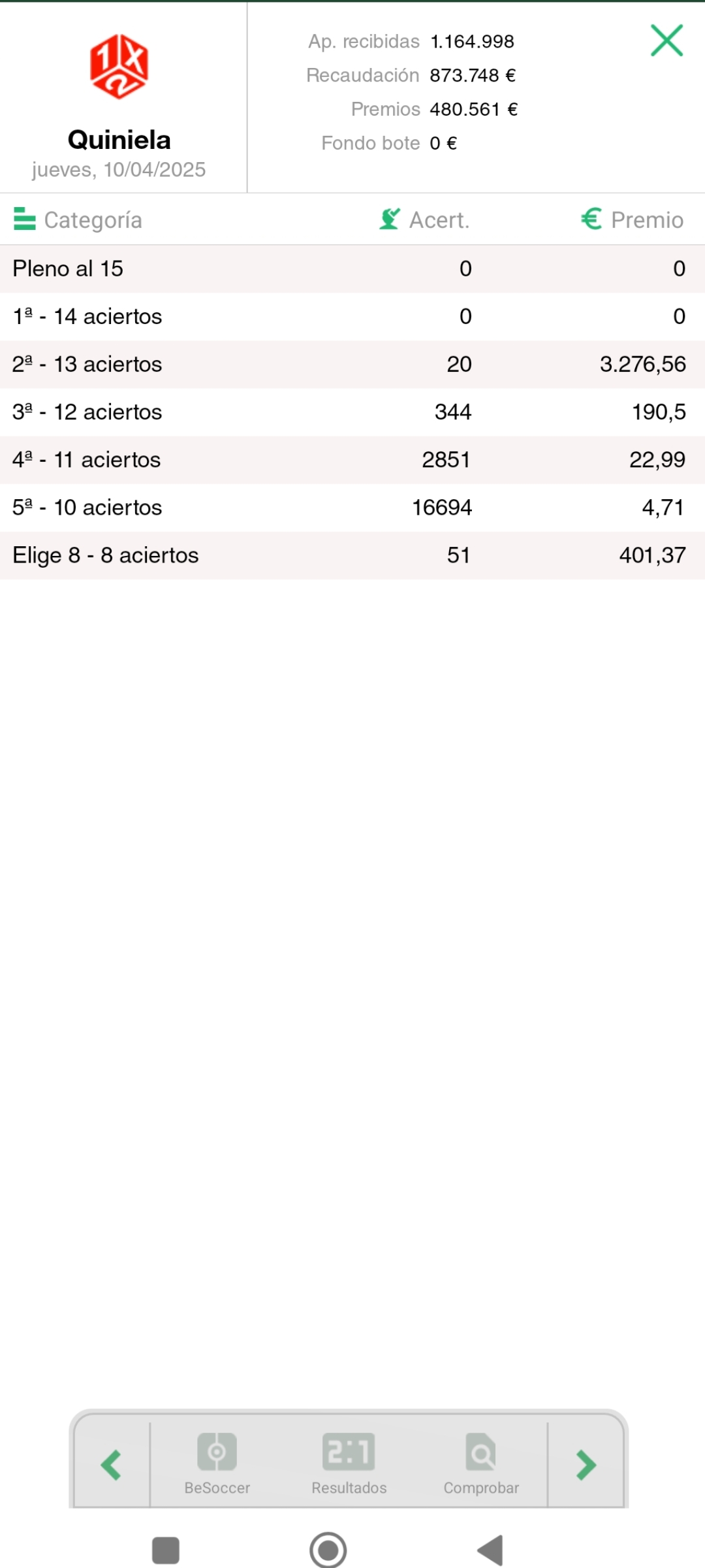 . Al finalizar cada jornada, mostramos los premios que se reparten, asi como los aciertos conseguidos.
