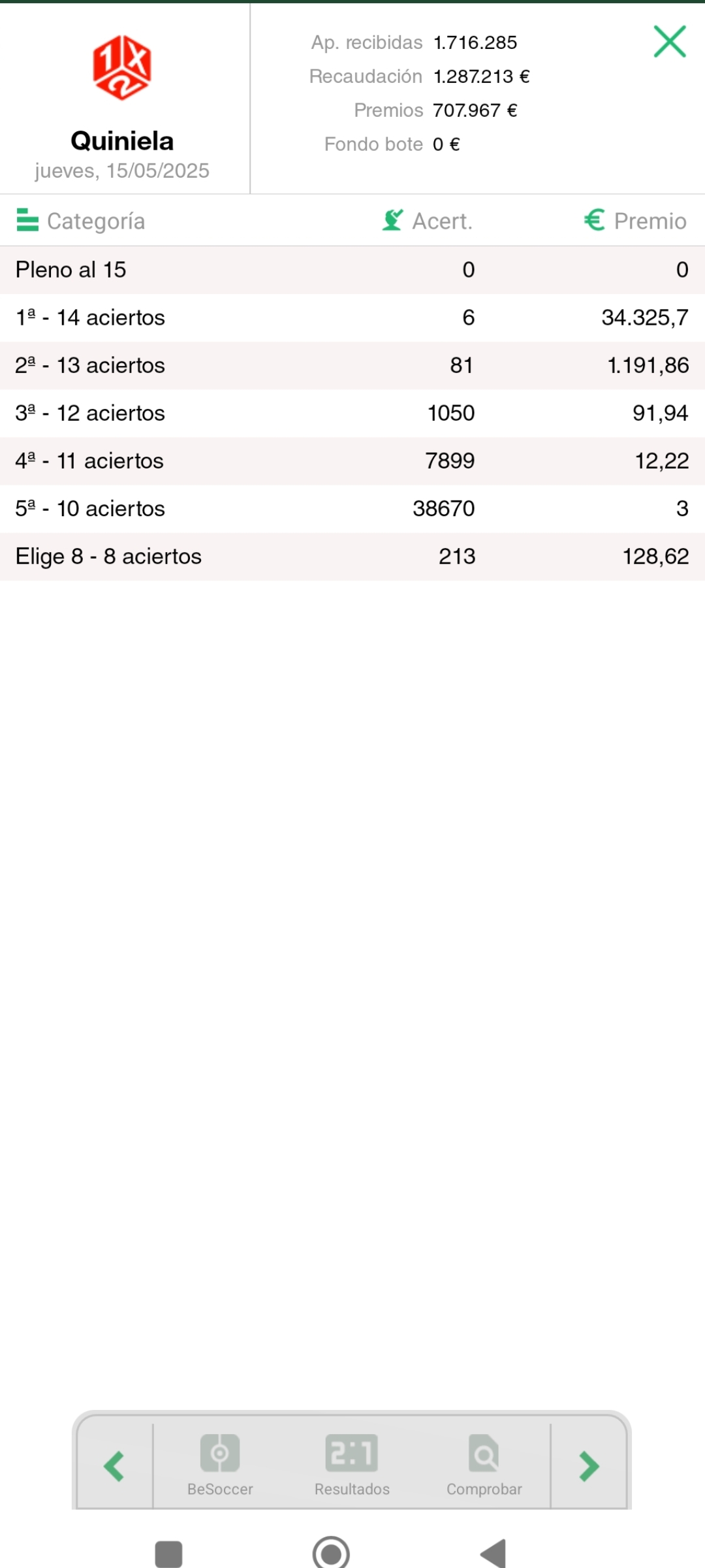 . Al finalizar cada jornada, mostramos los premios que se reparten, asi como los aciertos conseguidos.