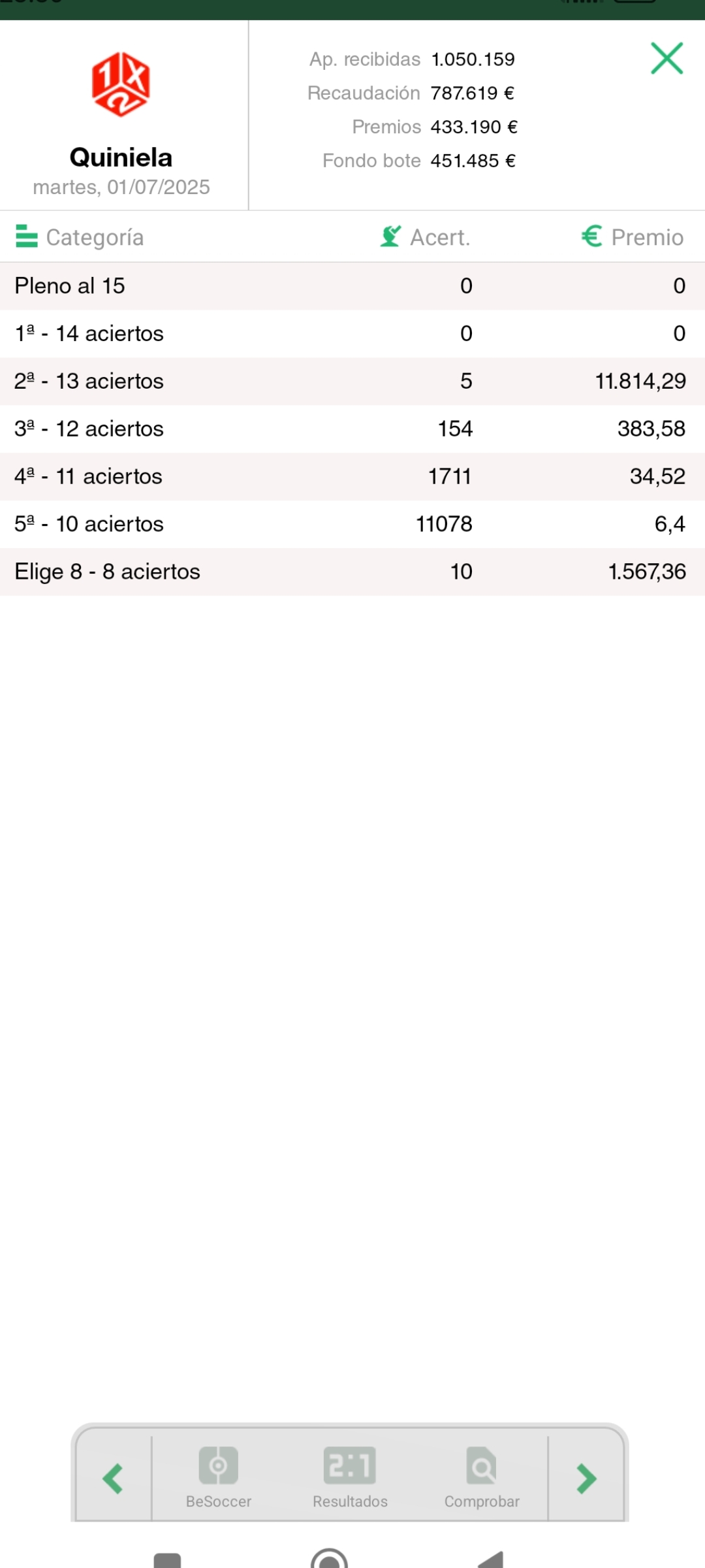 . Al finalizar cada jornada, mostramos los premios que se reparten, asi como los aciertos conseguidos.