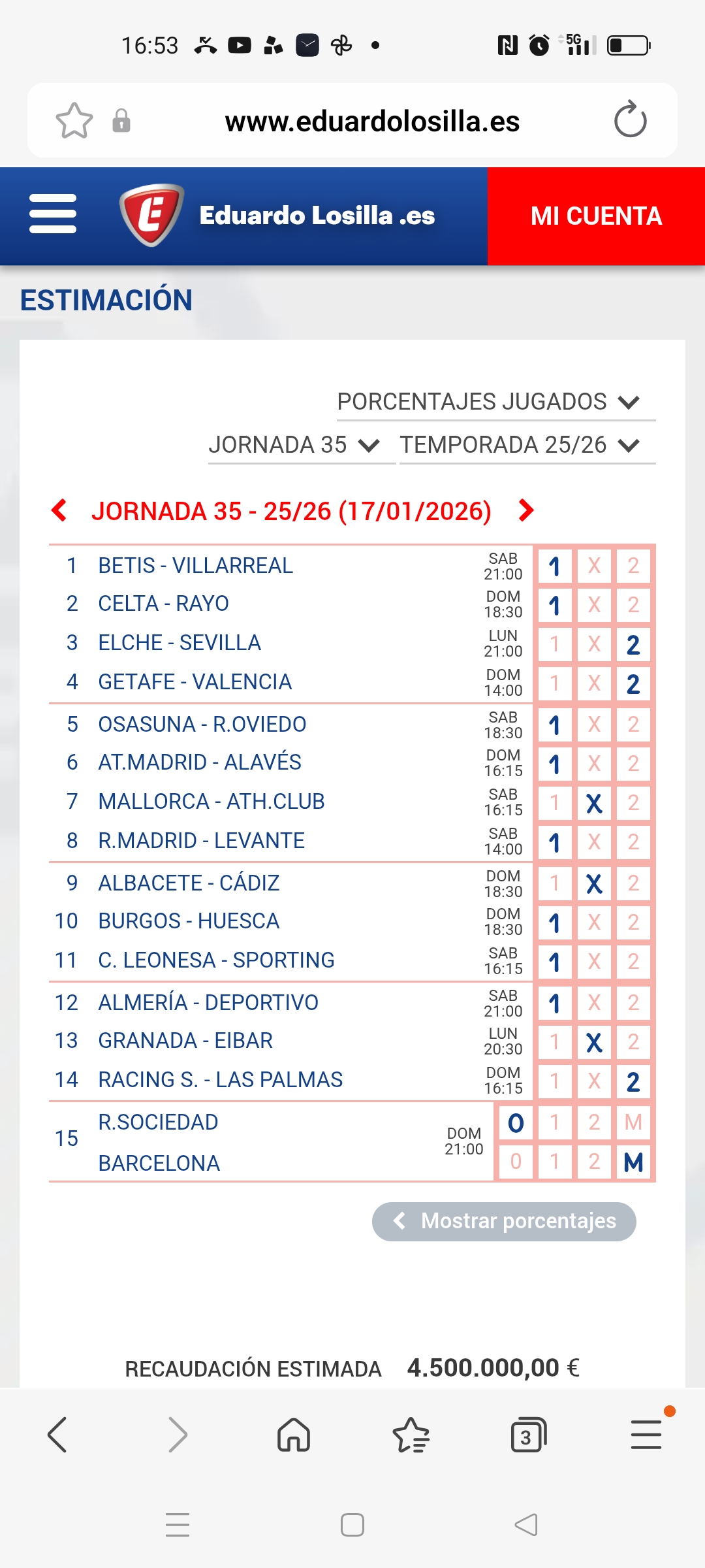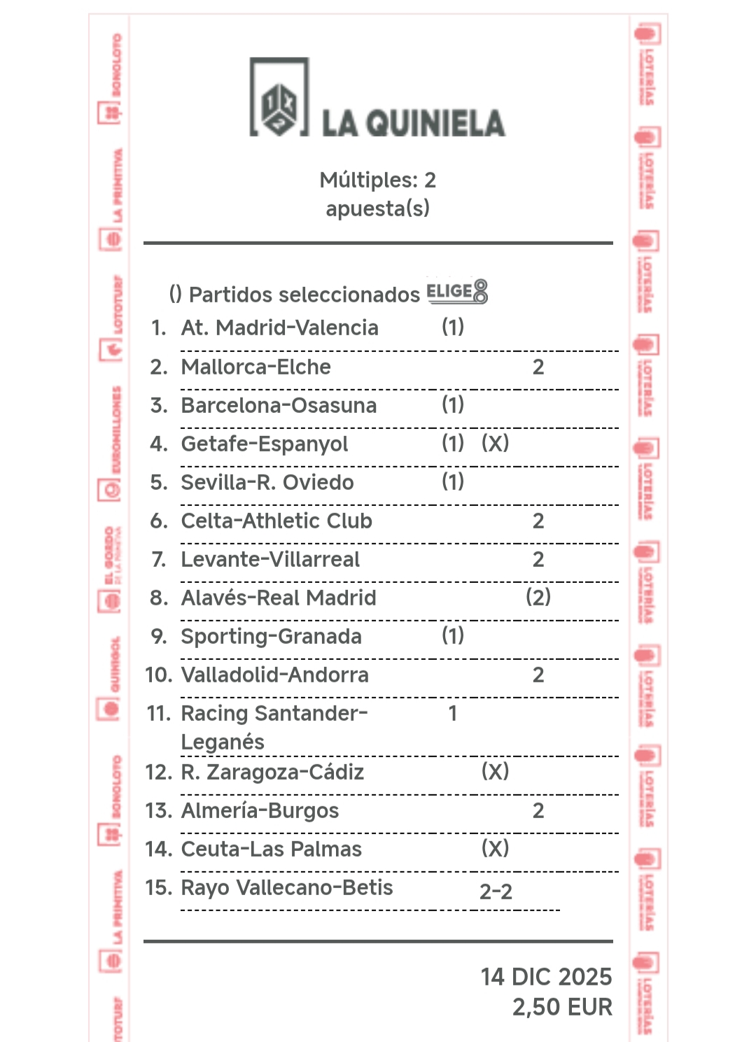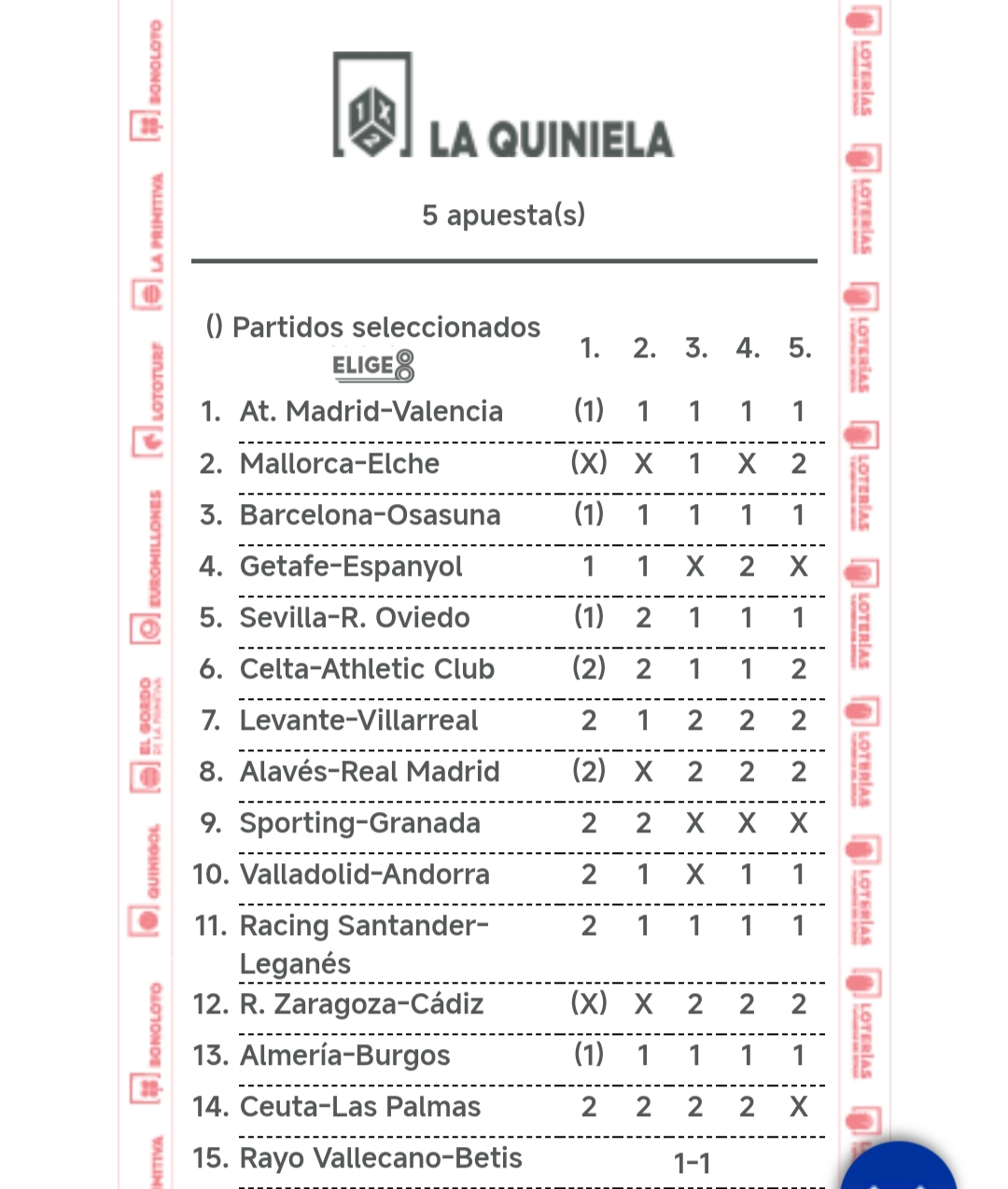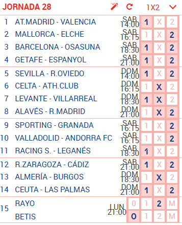 En esta página se muestra una estimación de los premios que se repartirán en la jornada cuando está en juego. Puedes simular resultados para comprobar qué premio se podría repartir en cada categoría de aciertos. Los resultados son estimativos en base a las estadísticas de los boletos sellados, no pueden ser exactos por no conocer la composición de cada uno de los boletos.