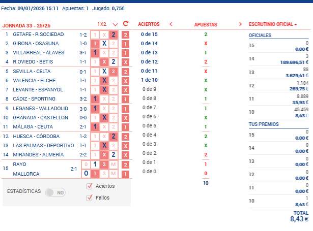 | 10 Aciertos | 85 - 109.676 | 1.294,12€ - 1,00€ |