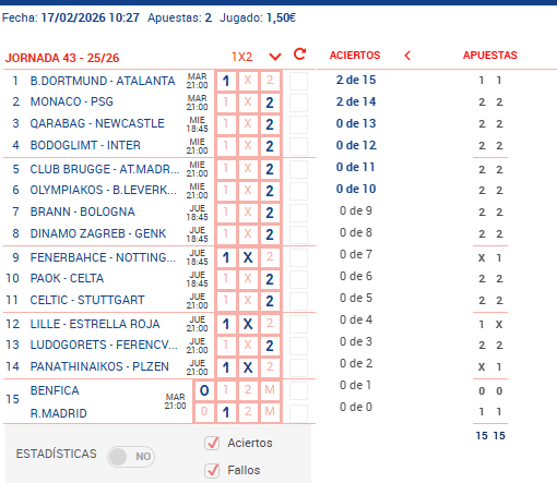 | 10 Aciertos | 338 - 75.936 | 325,44€ - 1,45€ |